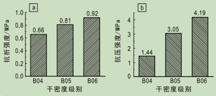 ▲ 不同干密度級別砂加氣混凝土抗折和抗壓強(qiáng)度